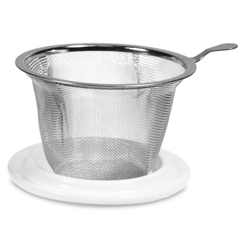 Kleurrijke thee mok met bijpassend deksel en roestvrijstalen theezeefje, in een kartonnen verpakking.